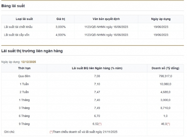 Trên thị trường liên ngân hàng, áp lực thanh khoản vẫn còn đáng kể khi lãi suất tiếp tục neo cao trong suốt giai đoạn từ 8-12/12. Lãi suất VND qua đêm duy trì quanh 7,33-7,49%, tăng nhẹ so với tuần trước đó. Các kỳ hạn 1 tuần và 2 tuần dao động trong vùng 7,36-7,57%, lãi suất 1 tháng duy trì quanh 6,8-7,4%, và kỳ hạn 3 tháng ổn định ở mức 7,18-7,45%. Ghi nhận đến 12/12, toàn bộ các kỳ hạn ngắn và có doanh số cao trong giao dịch giữa các ngân hàng đều đang có lãi suất từ trên 7%.